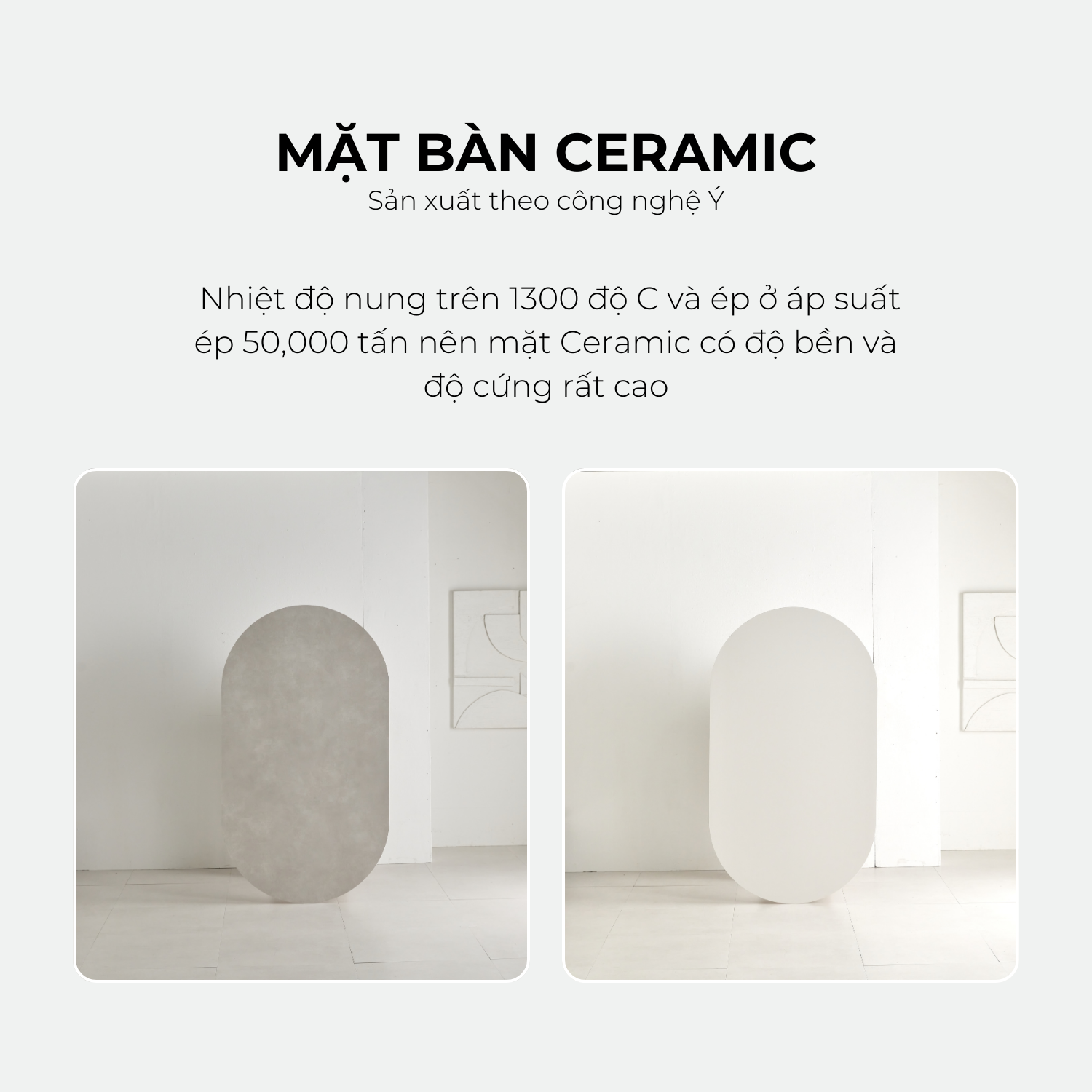 - Sản xuất theo công nghệ Ý với nhiệt độ nung trên 1300 độ C và ép ở áp suất ép 50,000 tấn nên mặt Ceramic có độ bền và độ cứng rất cao, chịu nhiệt tốt, khả năng chống thấm, chống ố màu và chống trầy xước hoàn hảo