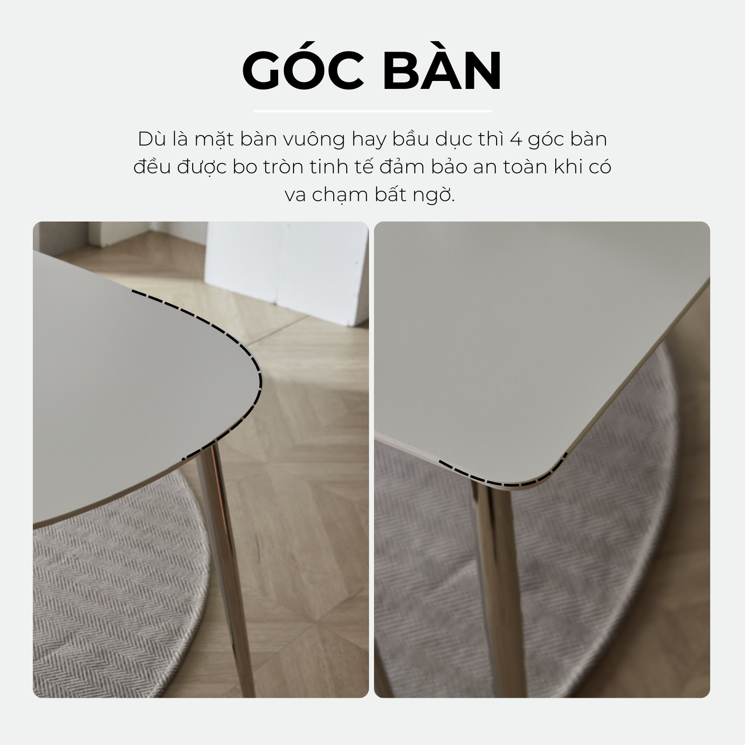 - Dù là mặt bàn vuông hay bầu dục thì 4 góc bàn đều được bo tròn tinh tế đảm bảo an toàn khi có va chạm bất ngờ.