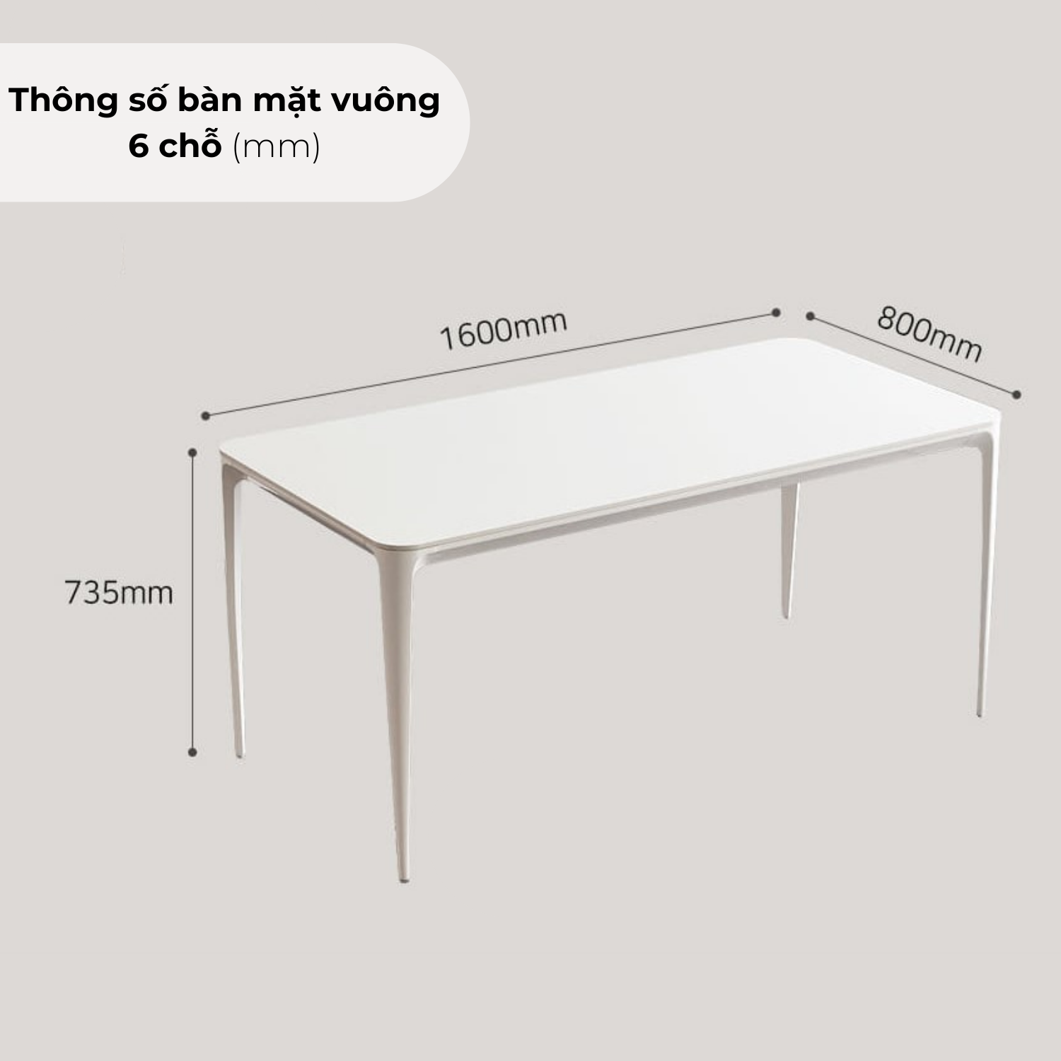 Dài 1600 x Rộng 800 x Cao 735 (mm) - Mặt bàn vuông - 6 chỗ