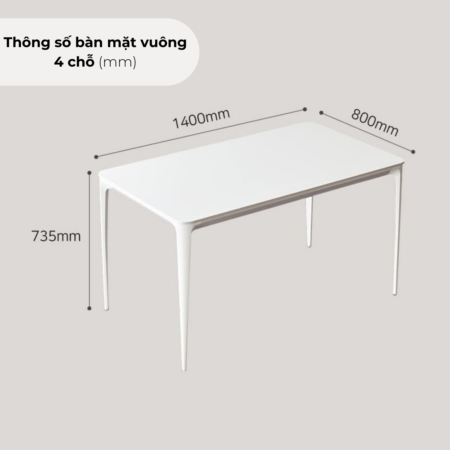 Dài 1400 x Rộng 800 x Cao 735 (mm) - Mặt bàn vuông - 4 chỗ