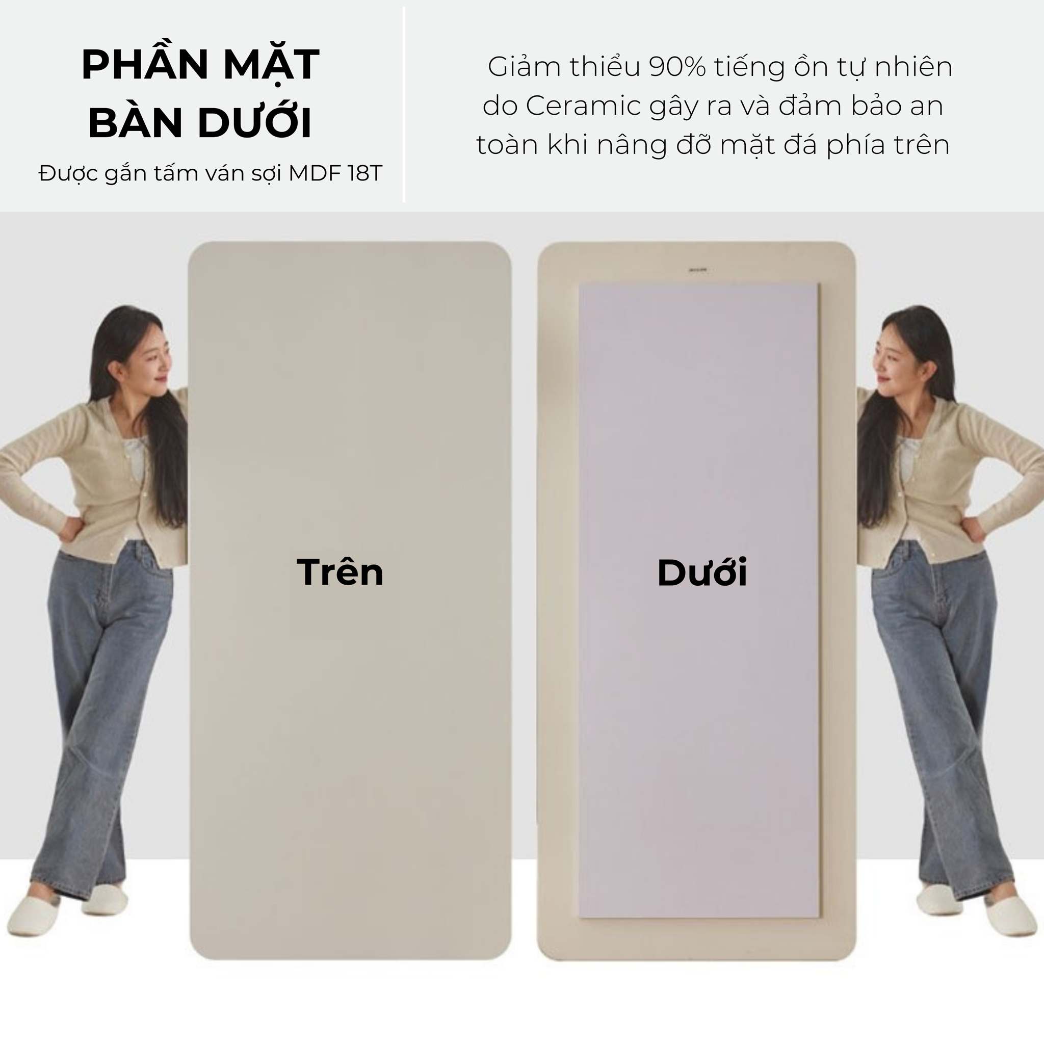 - Phần dưới mặt bàn được gắn tấm ván sợi MDF 18T giảm thiểu 90% tiếng ồn tự nhiên do Cereamic gây ra và đảm bảo an toàn khi nâng đỡ mặt đá phía trên đồng thời ngăn phần trên bị trượt nên có thể sử dụng bền bỉ theo thời gian mà không phải sản phẩm nào cũng có.