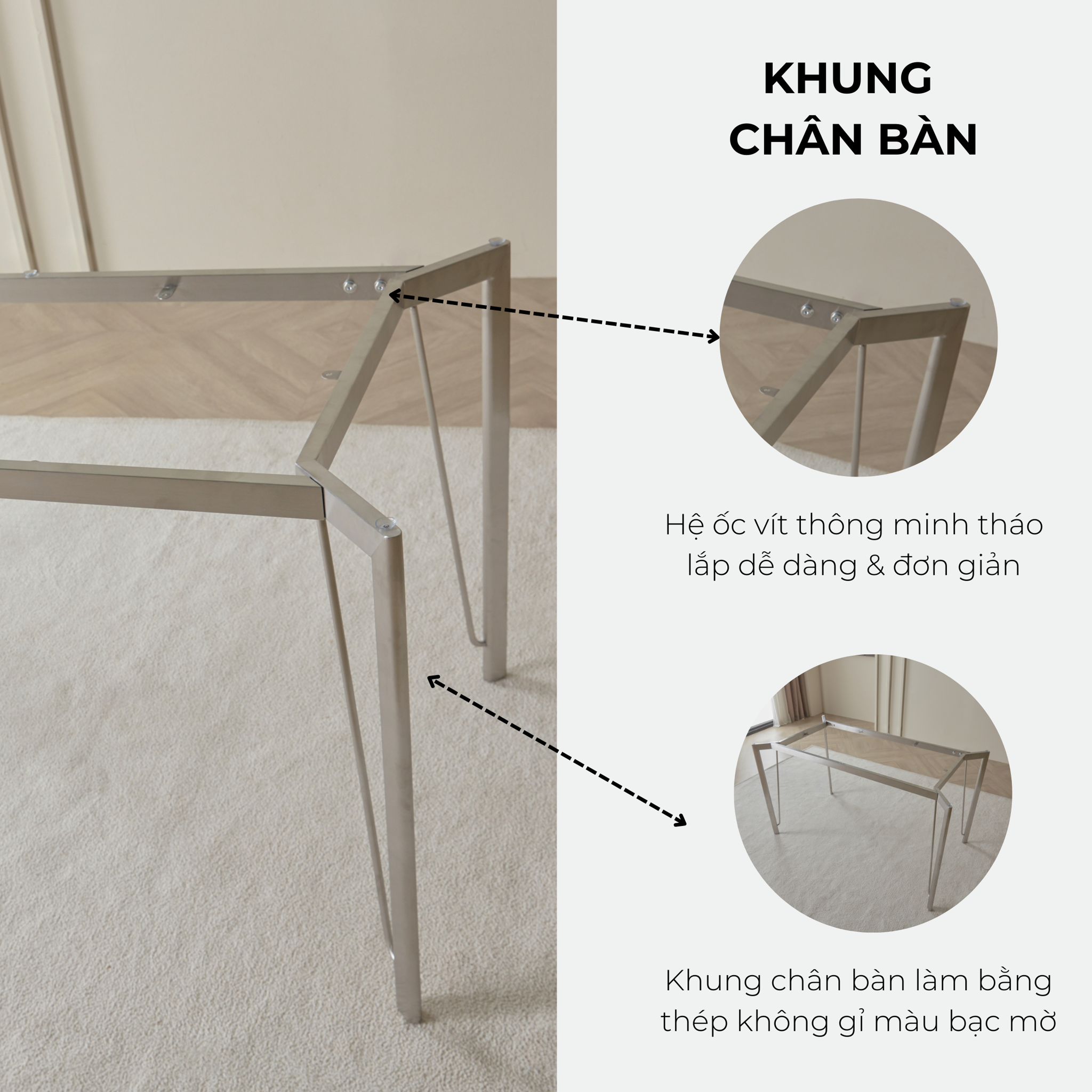 - Khung chân bàn: Thép không gỉ màu bạc mờ phong cách