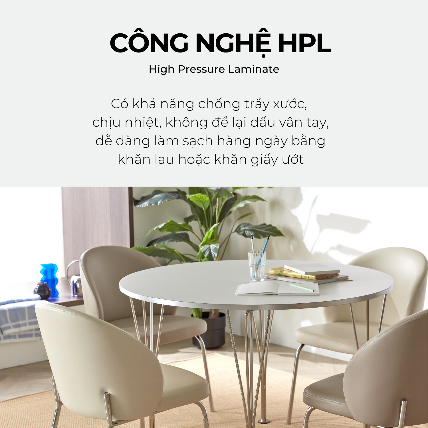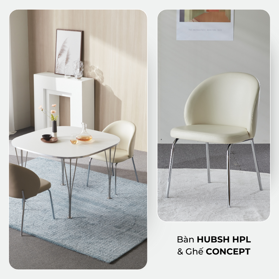 Với bàn ăn HUBSH HPL của ALCOVA FURNITURE, nhà bếp của bạn giờ đây vừa tiện dụng vừa đẹp mắt
