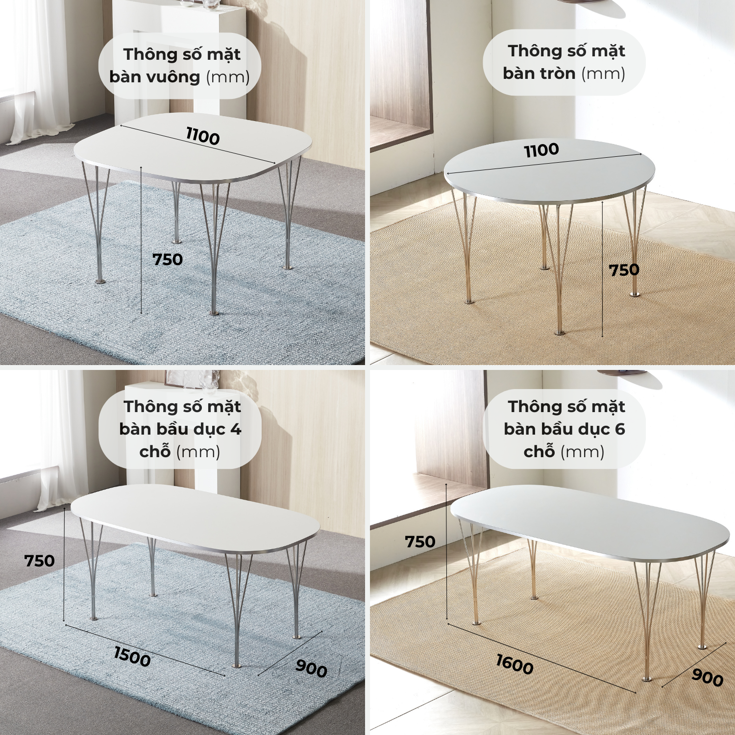 Dài 1500 x Rộng 900 x Cao 750 (mm) - Mặt bàn bầu dục – 4 chỗ