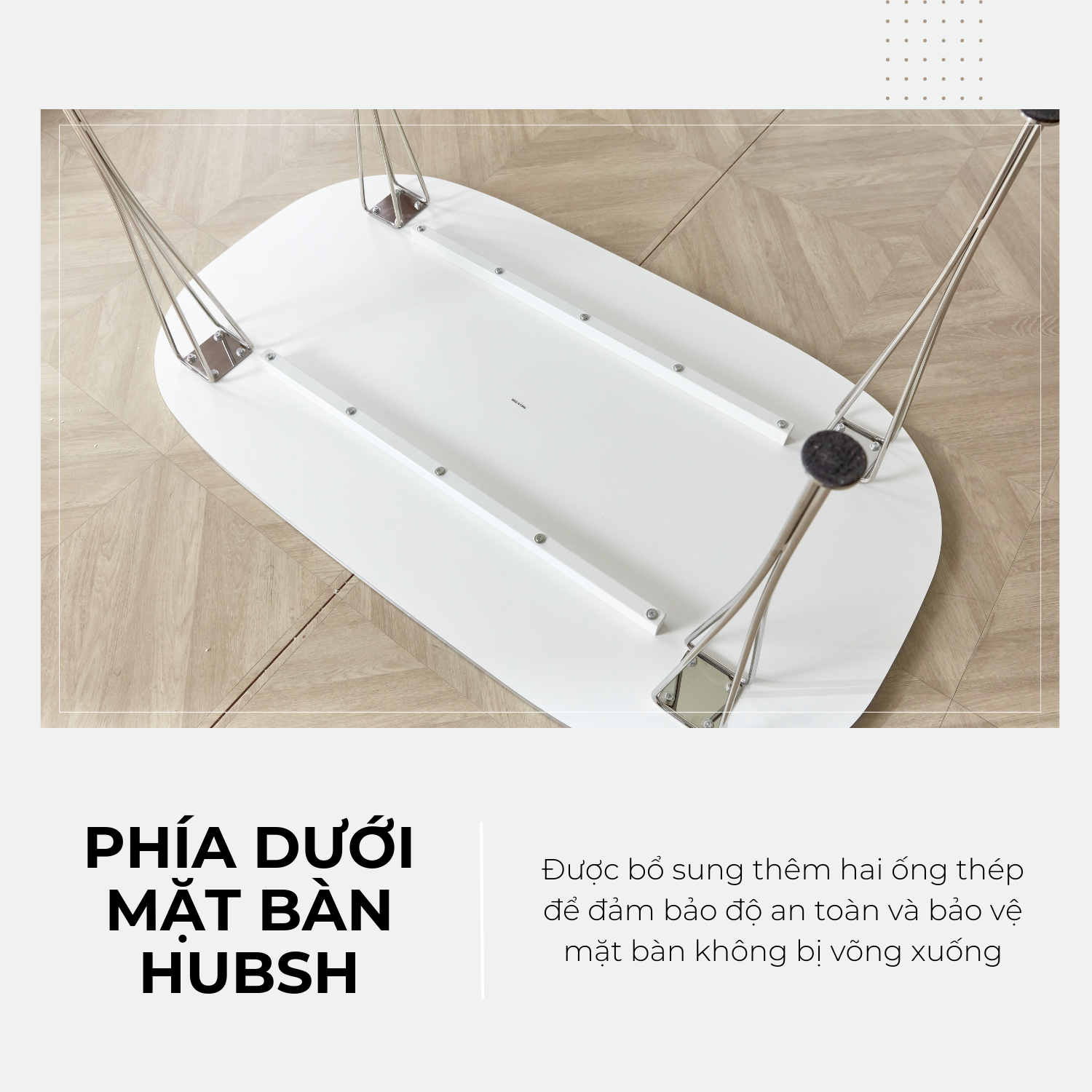 Chân bàn HUBSH làm từ thép không gỉ, bền bỉ và không rung lắc. Thiết kế chân bàn được gia công tỉ mỉ, sang trọng và không có đường nối hàn lộ ra ngoài.