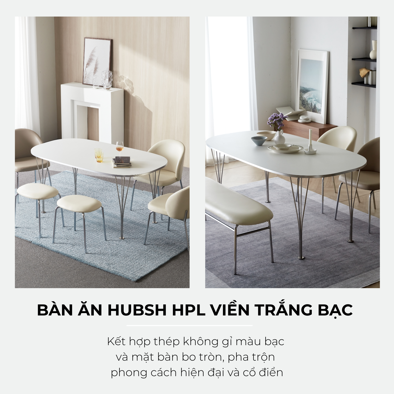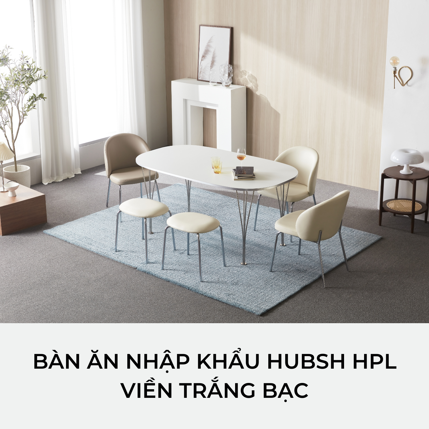 BÀN ĂN HUBSH HPL VIỀN TRẮNG BẠC NHẬP KHẨU (4 CHỖ / 6 CHỖ)
