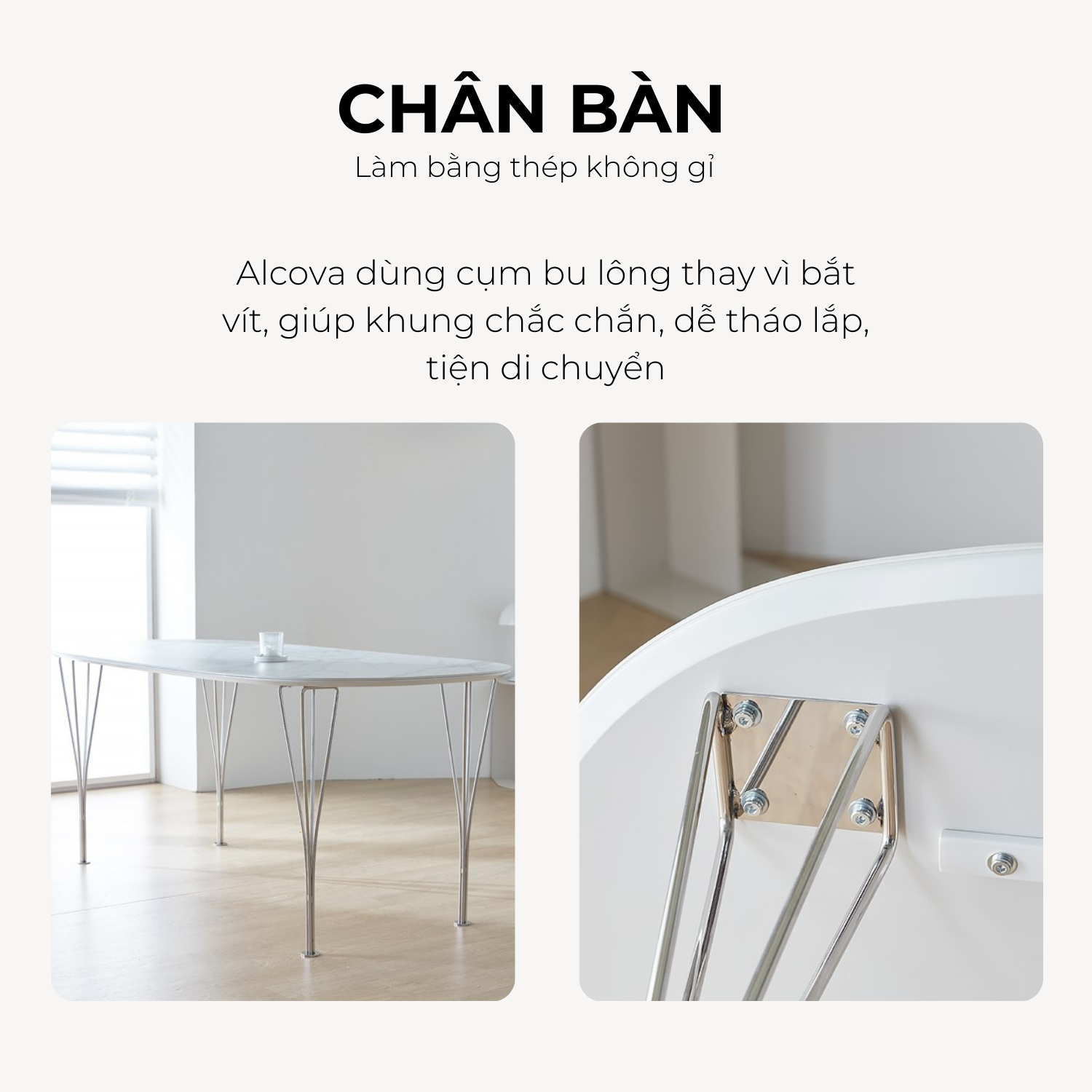 Khung chân bàn: Thép không gỉ màu bạc bóng