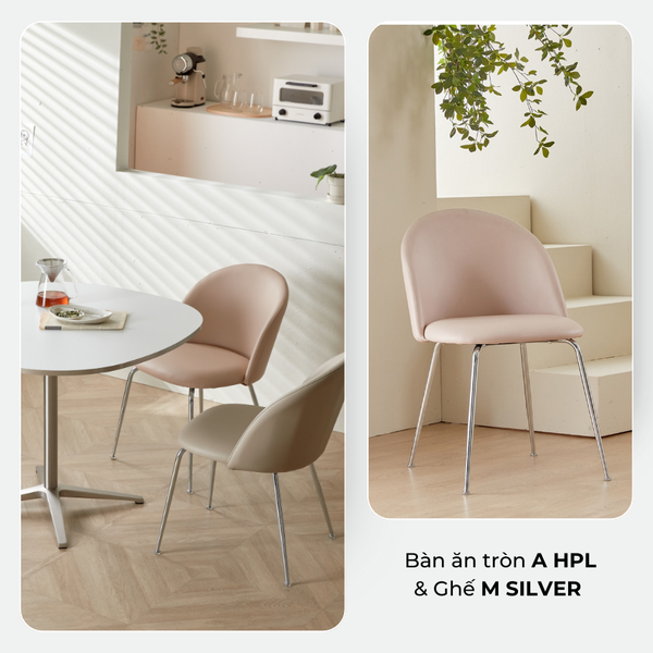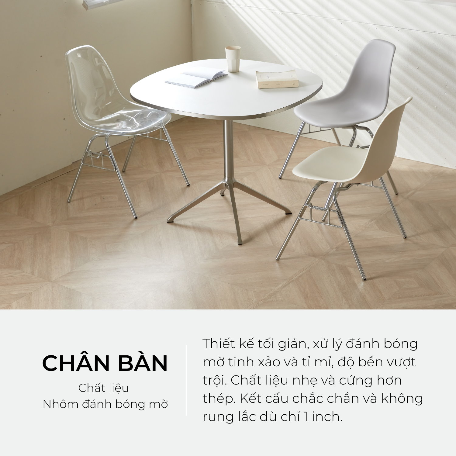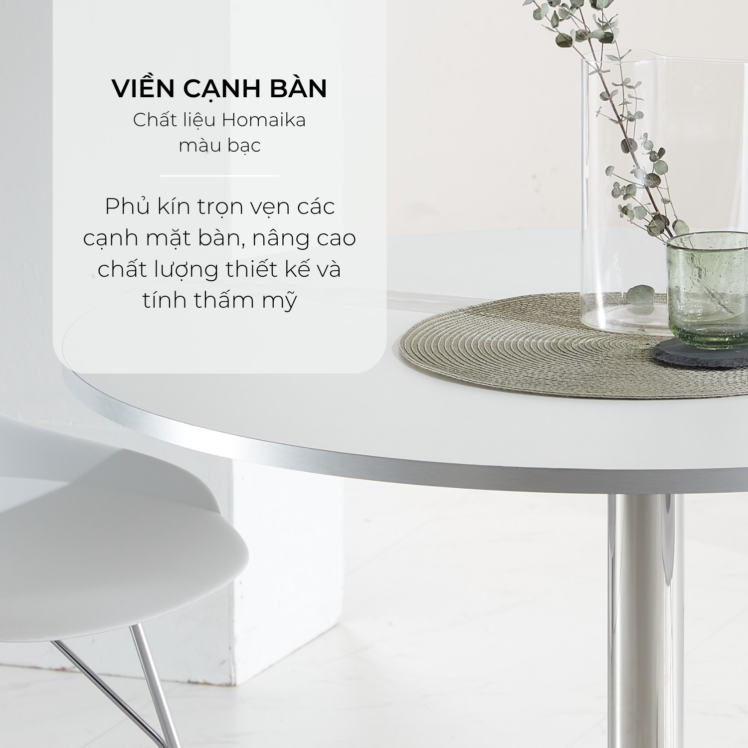 Phần viền xung quanh mặt bàn A HPL được làm bằng chất liệu Homaika màu bạc, giúp nâng cao chất lượng thiết kế.