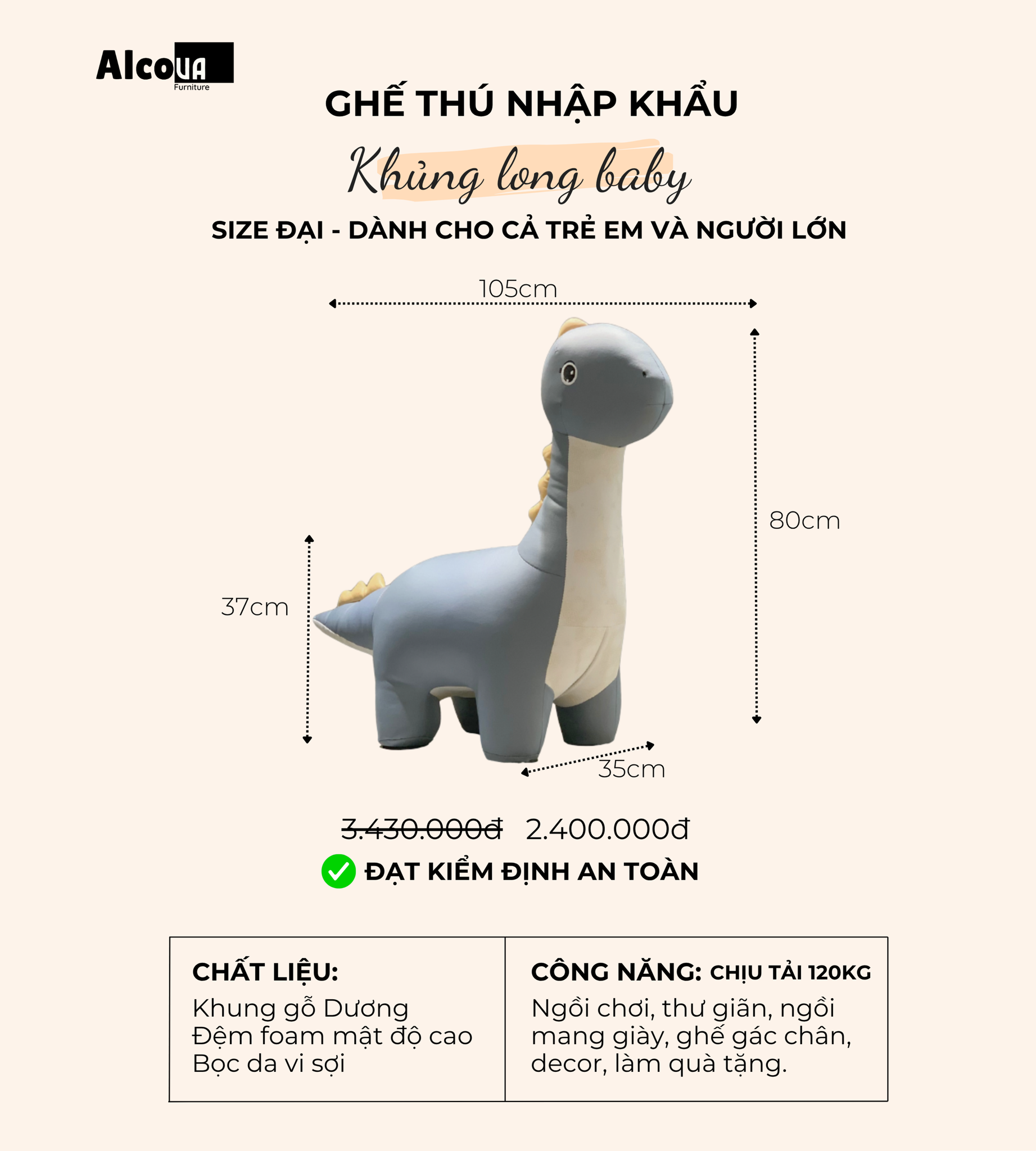 Mang phong cách đáng yêu và độc đáo, Ghế Thú hình Khủng long baby nhập khẩu siêu hot của thương hiệu Alcova là lựa chọn lý tưởng cho không gian trang trí hay khu vực vui chơi của bé con. Được thiết kế với hình dạng thú khủng long baby dễ thương, ghế không chỉ là một món đồ trang trí mà còn là một món đồ chơi an toàn, thú vị dành cho trẻ em.