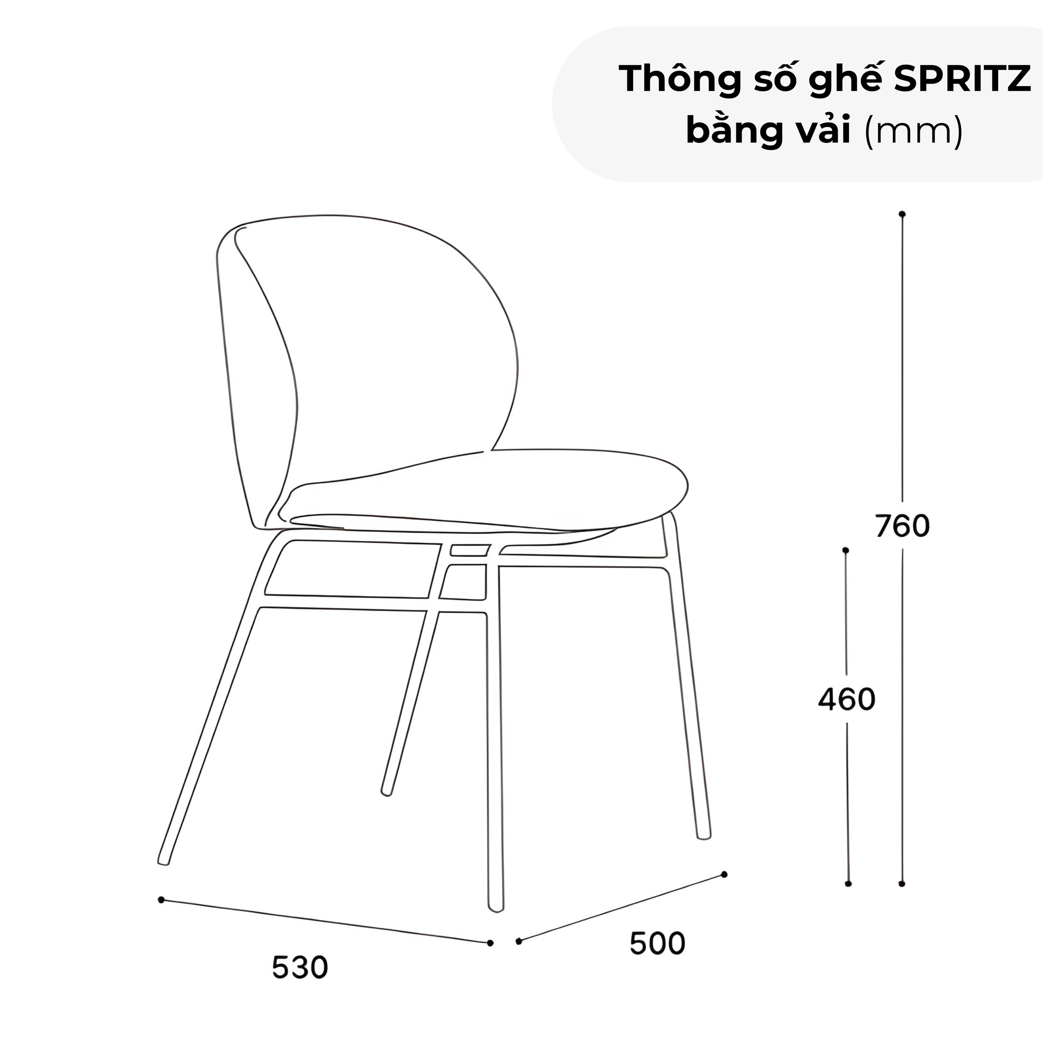 Rộng 500 x Dài 530 x Cao 760 (mm) - Độ cao tới đệm 460 mm